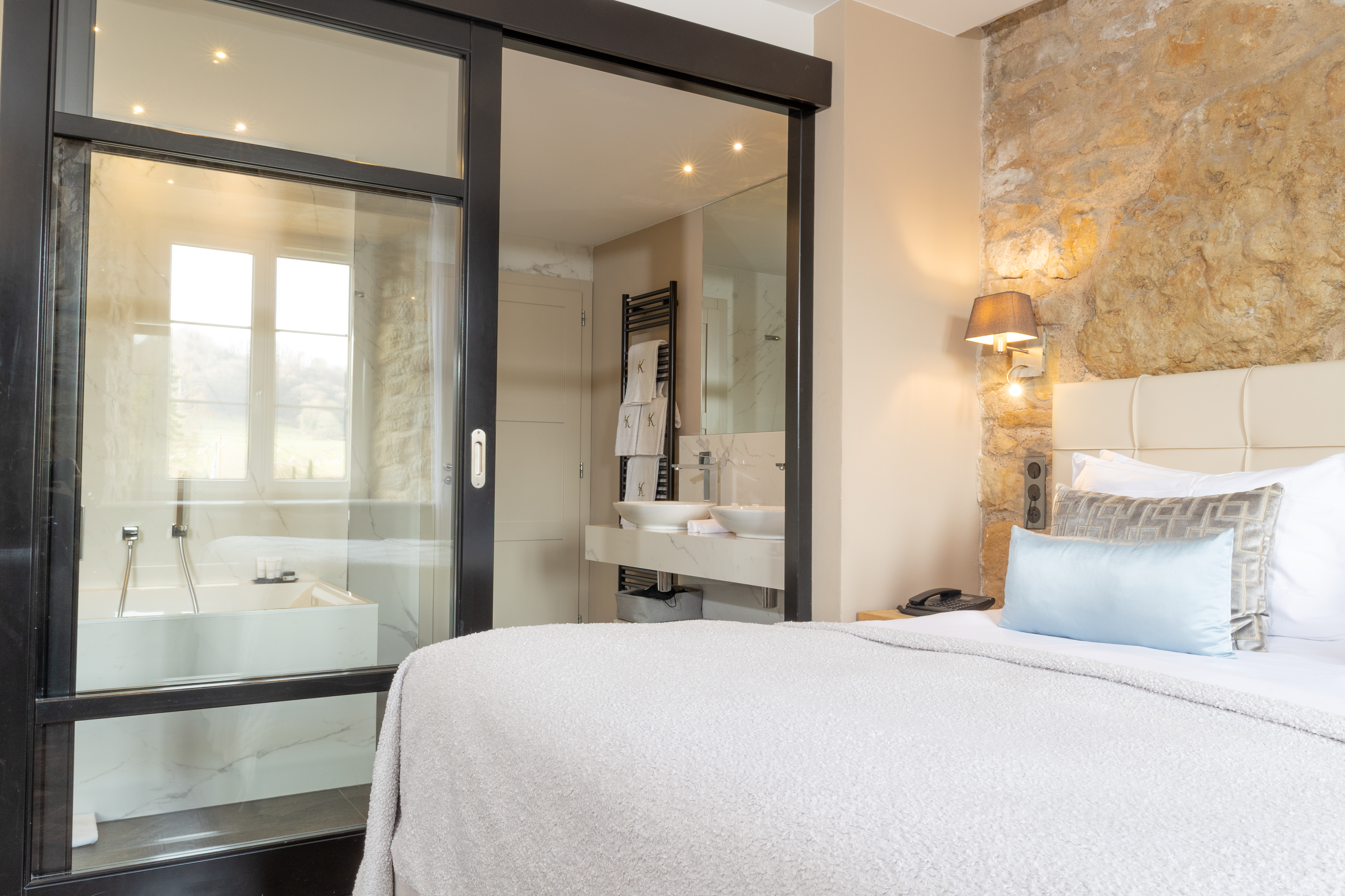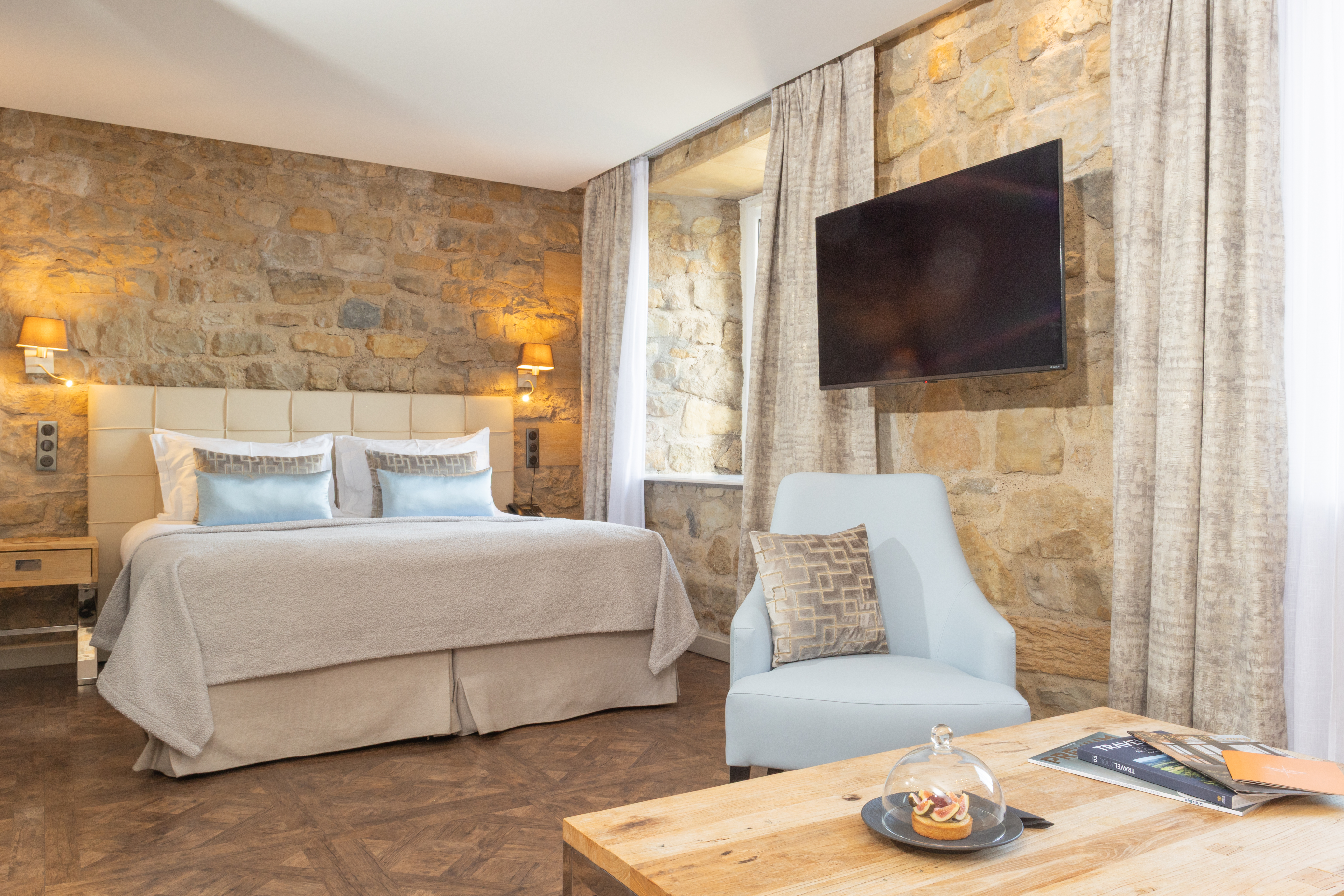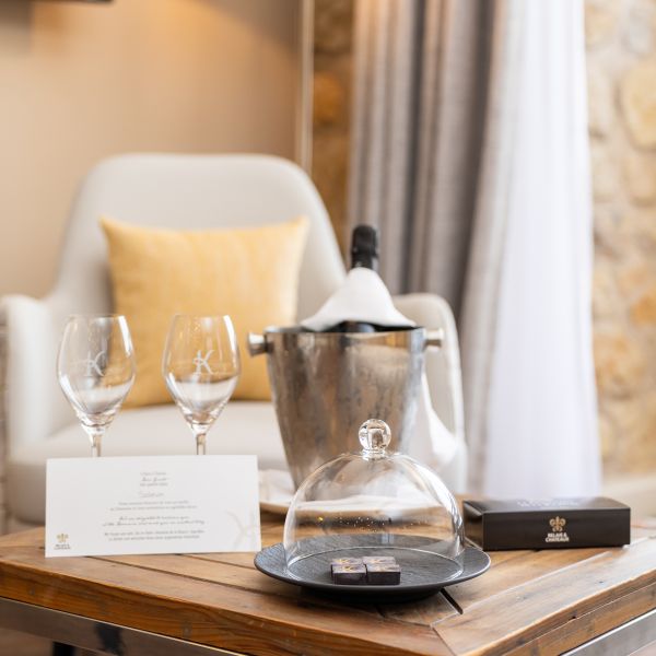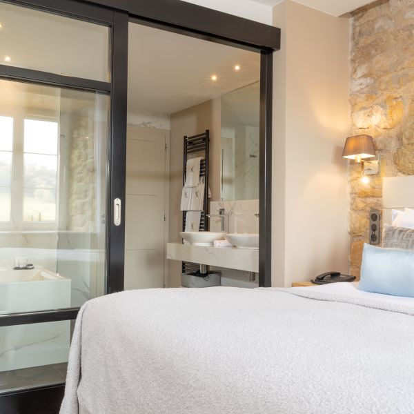 Our modern 34 m2 Junior Suite will enchant you with its blue-toned décor and Hermès-style hangings with its view over the Auberge, the entrance of the Domaine, the valley and the parking. This room has a king-sized bed, a large flat-screen TV, a Nespresso coffee machine, a bathroom with shower, bathtub, separate toilet and hair-dryer. It has Wi-Fi access, a safety deposit box and a mini-bar.