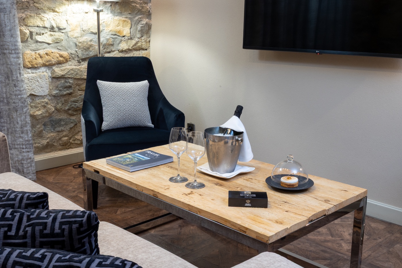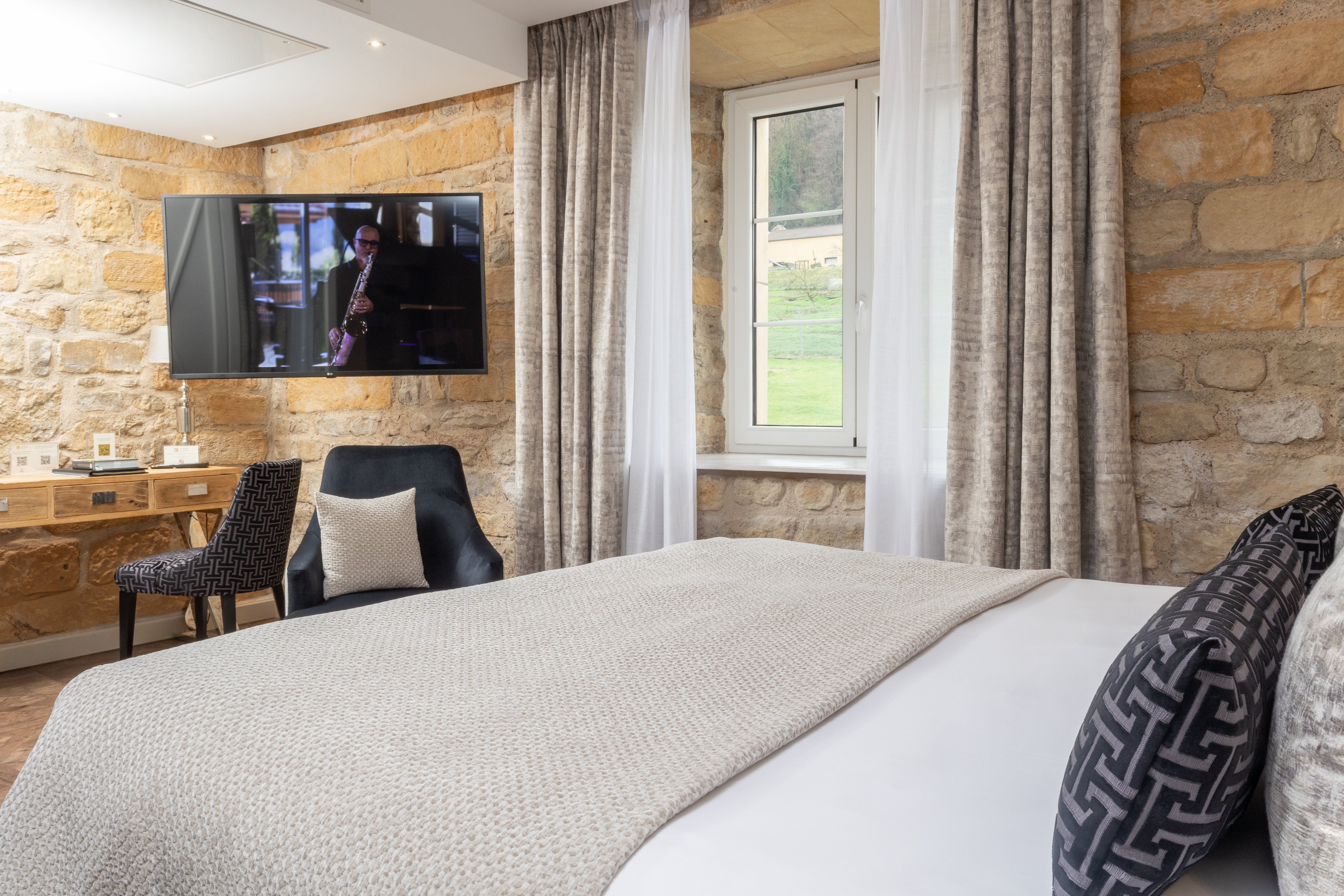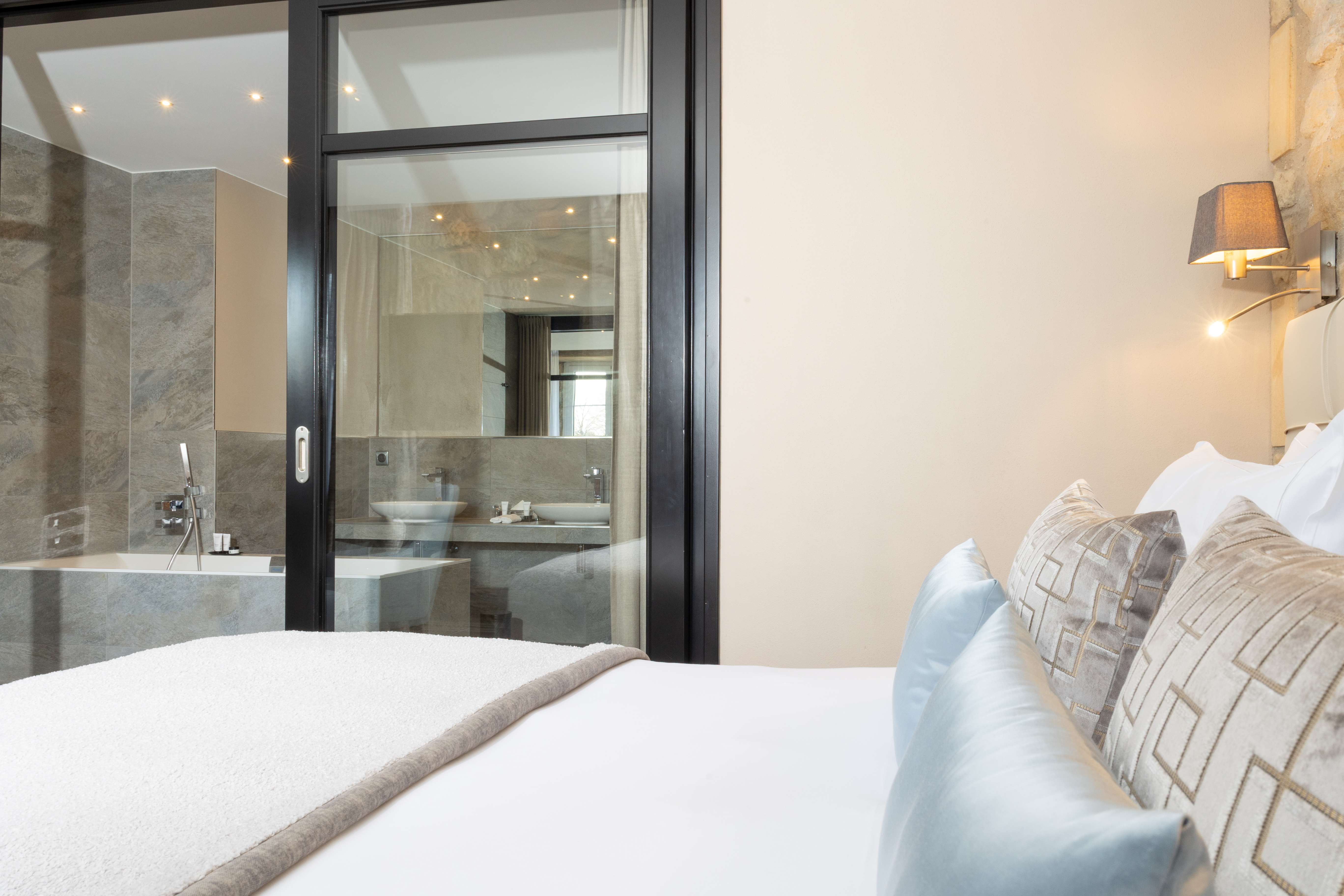 Our modern 34 m2 Junior Suite will enchant you with its blue-toned décor and Hermès-style hangings with its view over the Auberge, the entrance of the Domaine, the valley and the parking. This room has a king-sized bed, a large flat-screen TV, a Nespresso coffee machine, a bathroom with shower, bathtub, separate toilet and hair-dryer. It has Wi-Fi access, a safety deposit box and a mini-bar.
