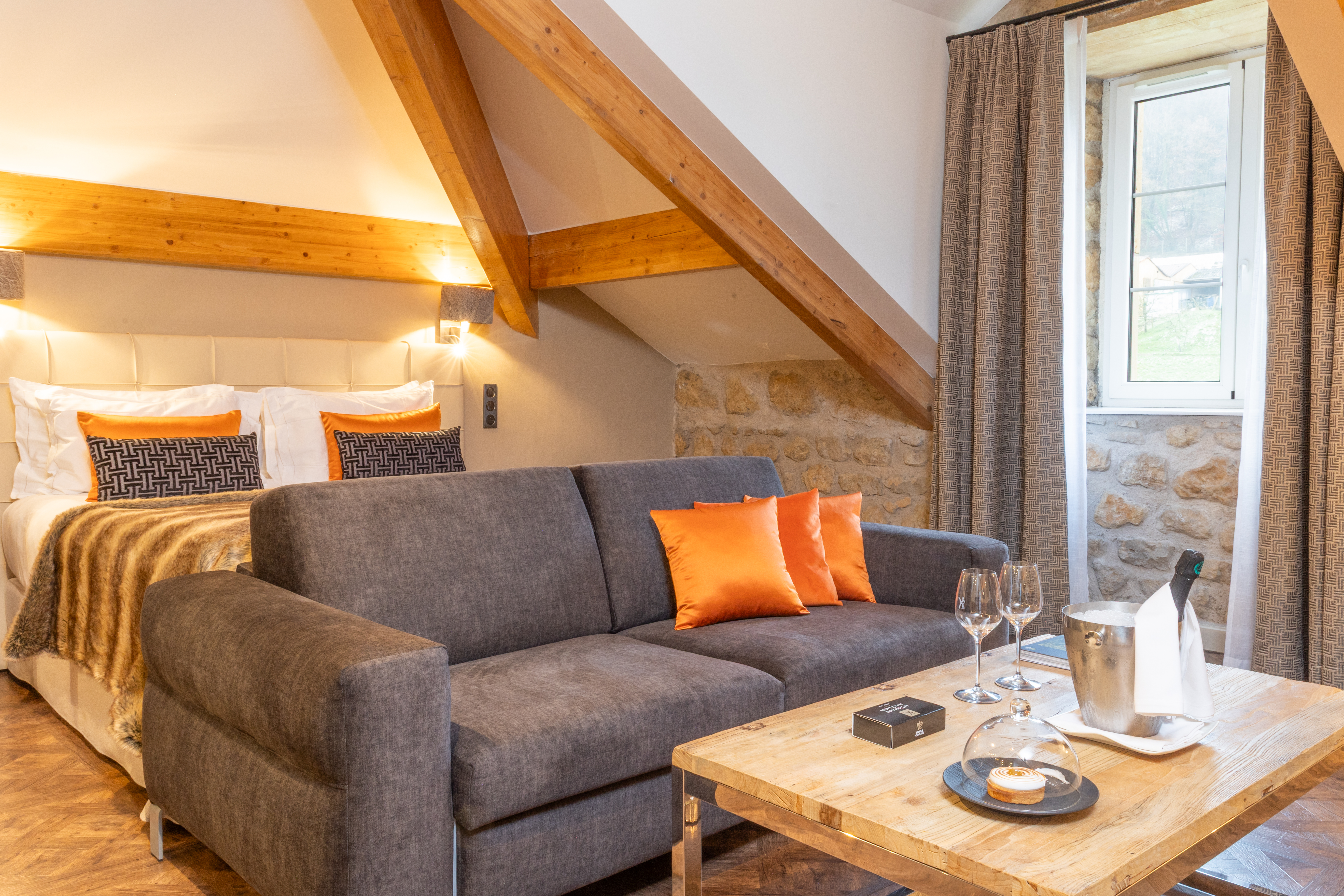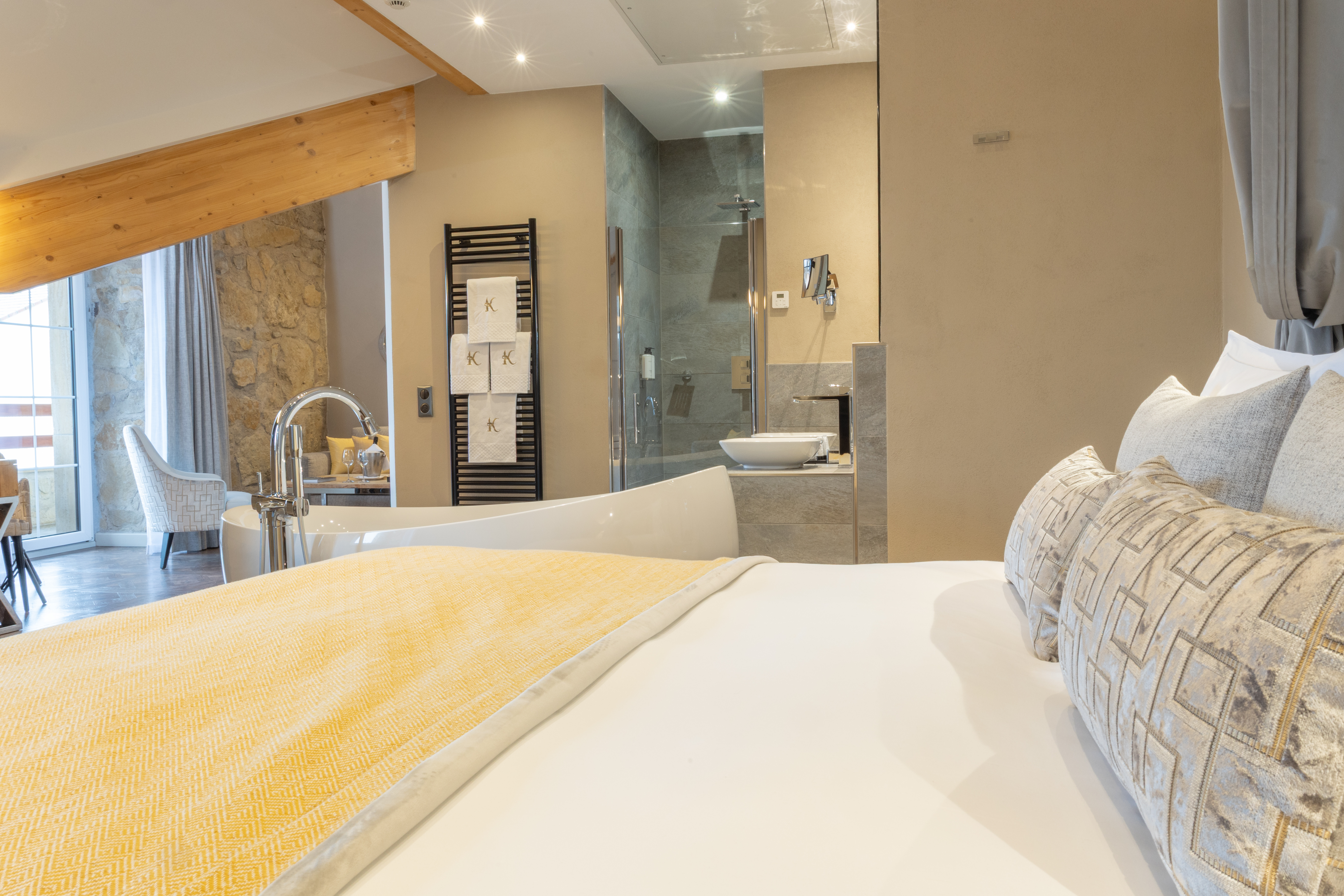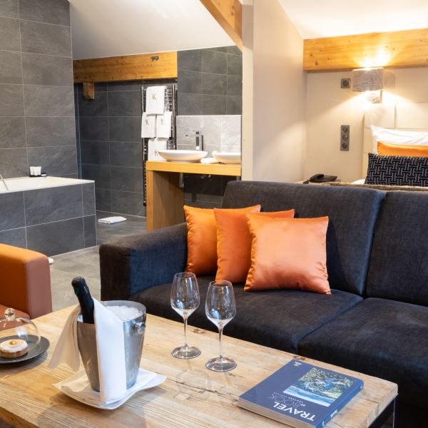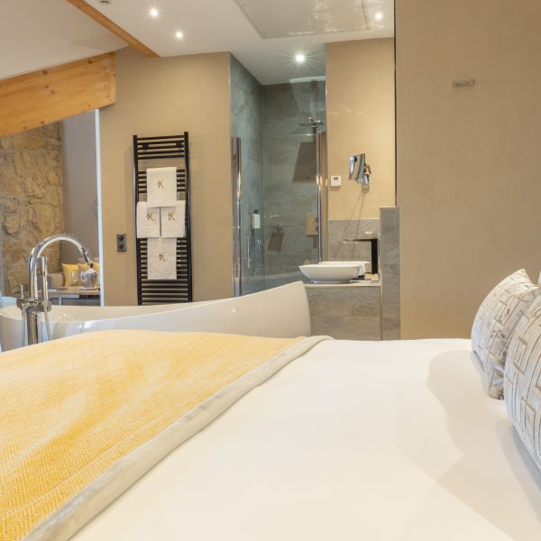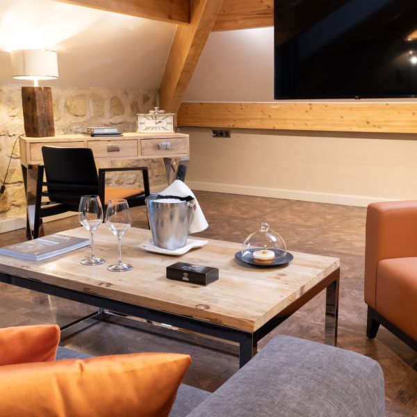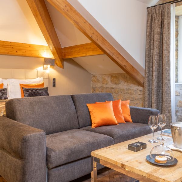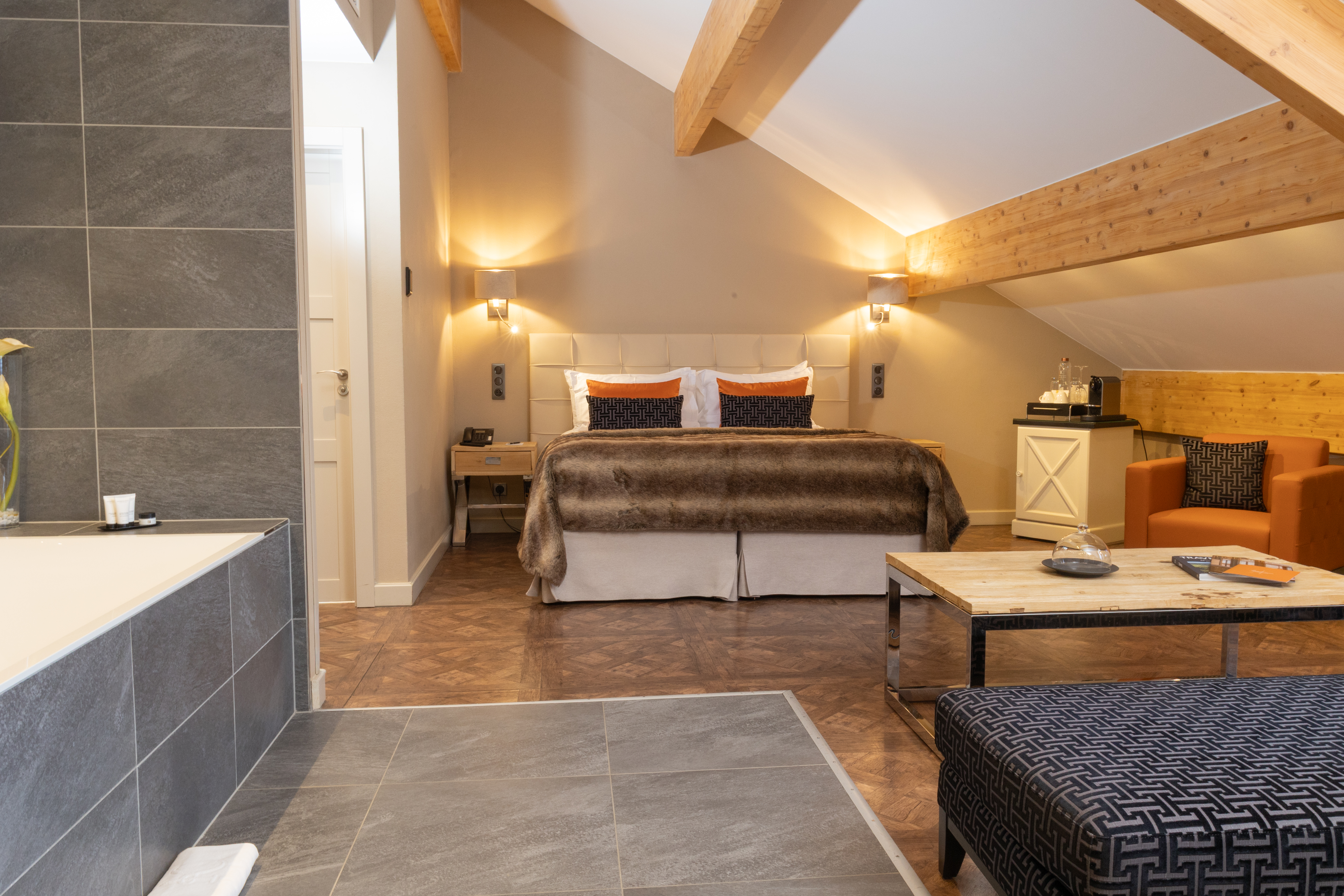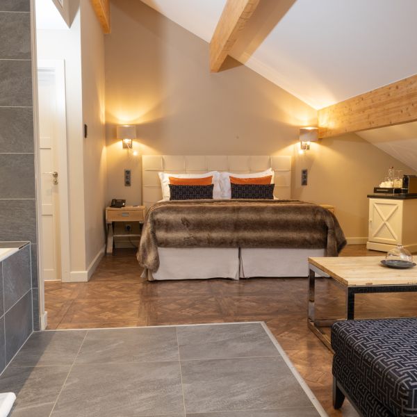 Enjoy a moment of relaxation in our 37 m2 Suite Joseph with its wooden beams and chic, cosy, countryside atmosphere, located at the top of the hotel with a nice view on the valle. This room has a king-sized bed, a large flat-screen TV, a Nespresso coffee machine, an open-plan bathroom with shower, bathtub, separate toilet and hair-dryer. It has Wi-Fi access, a safety deposit box and a mini-bar.