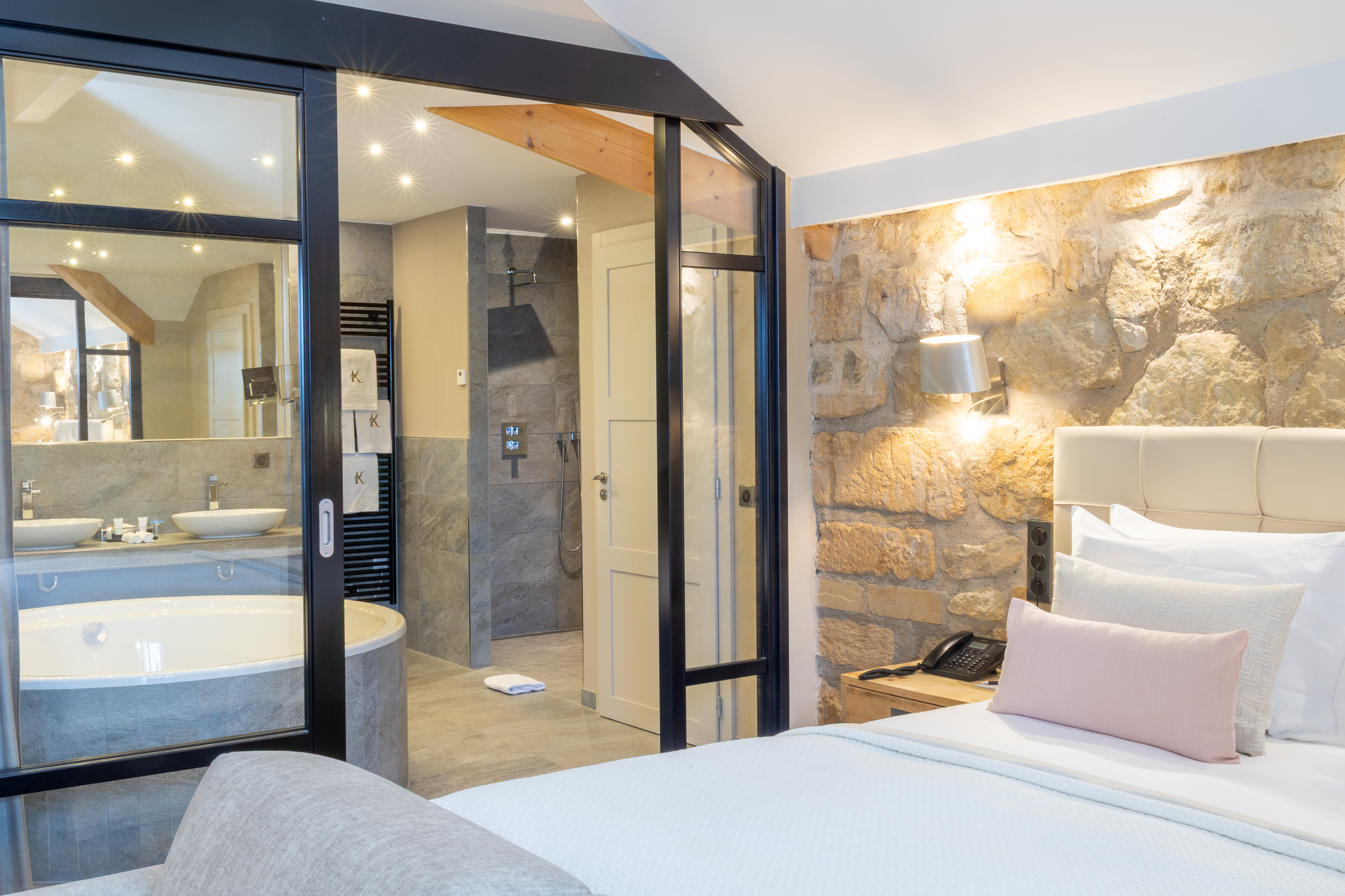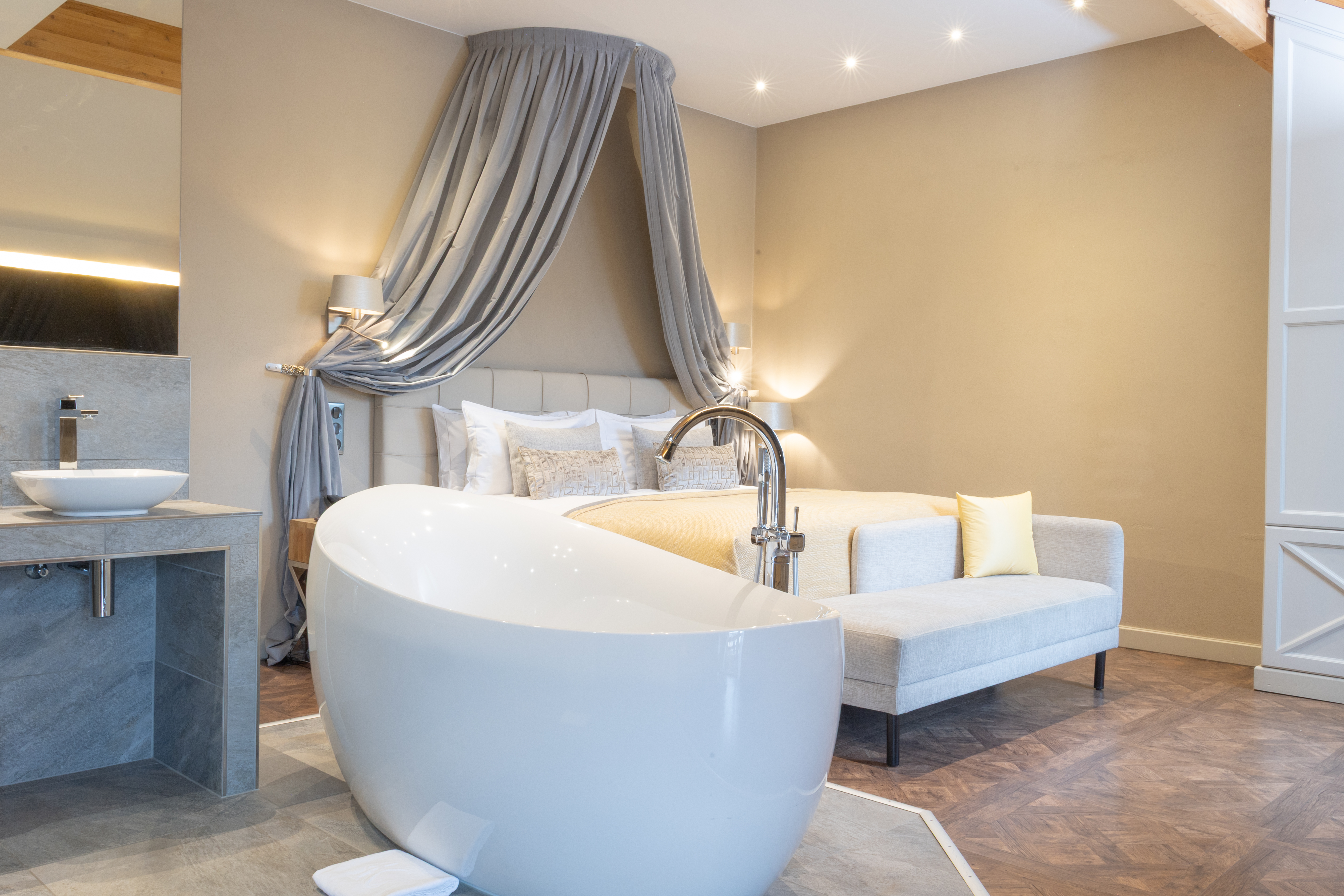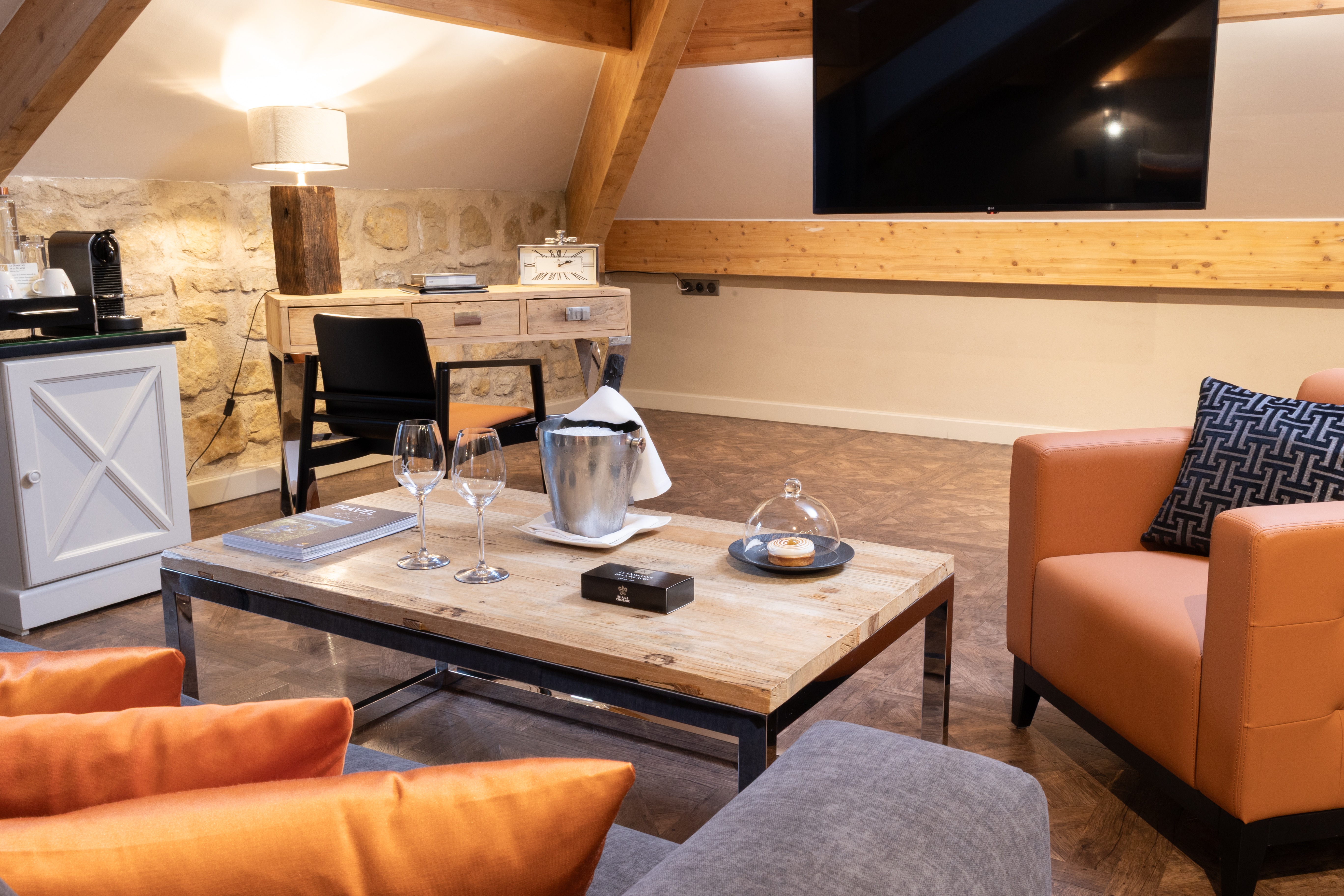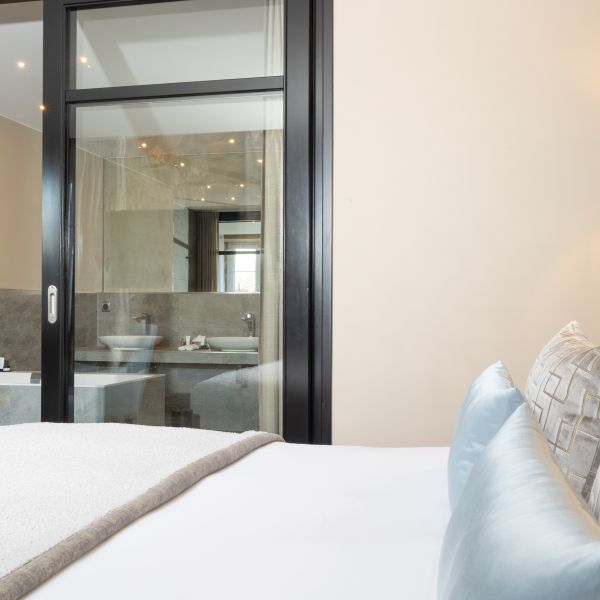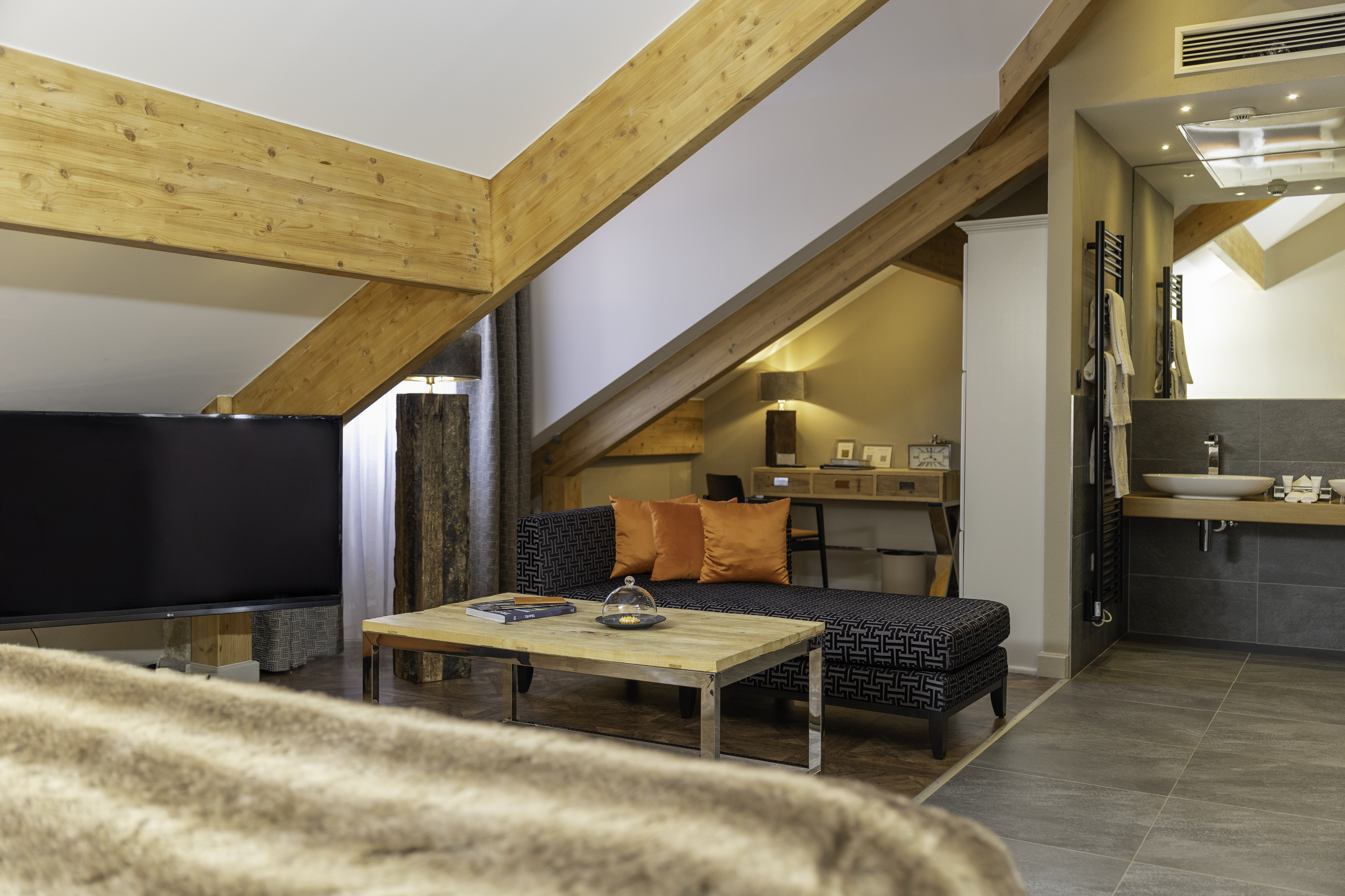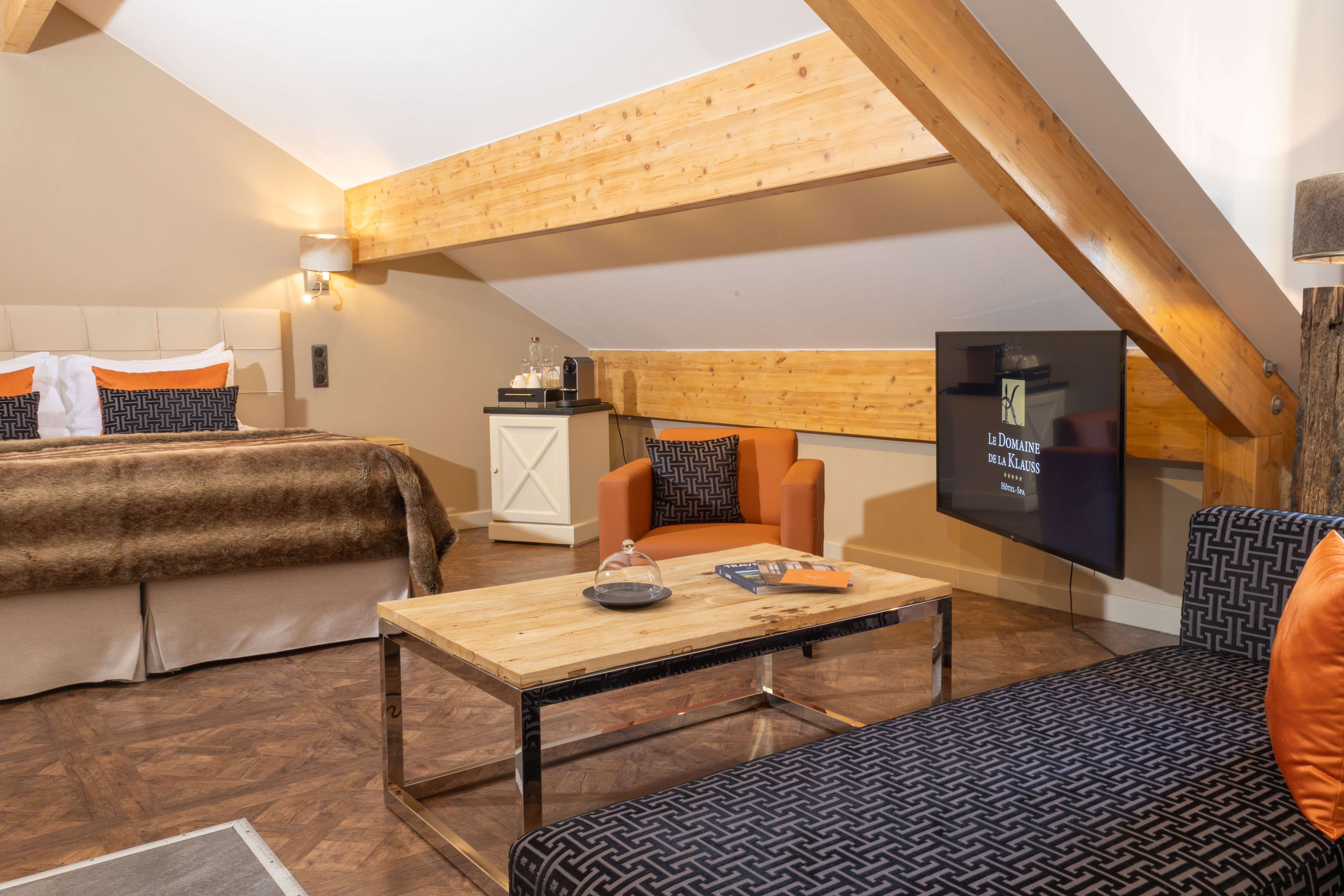 Enjoy a moment of relaxation in our 37 m2 Suite Joseph with its wooden beams and chic, cosy, countryside atmosphere, located at the top of the hotel with a nice view on the valle. This room has a king-sized bed, a large flat-screen TV, a Nespresso coffee machine, an open-plan bathroom with shower, bathtub, separate toilet and hair-dryer. It has Wi-Fi access, a safety deposit box and a mini-bar.