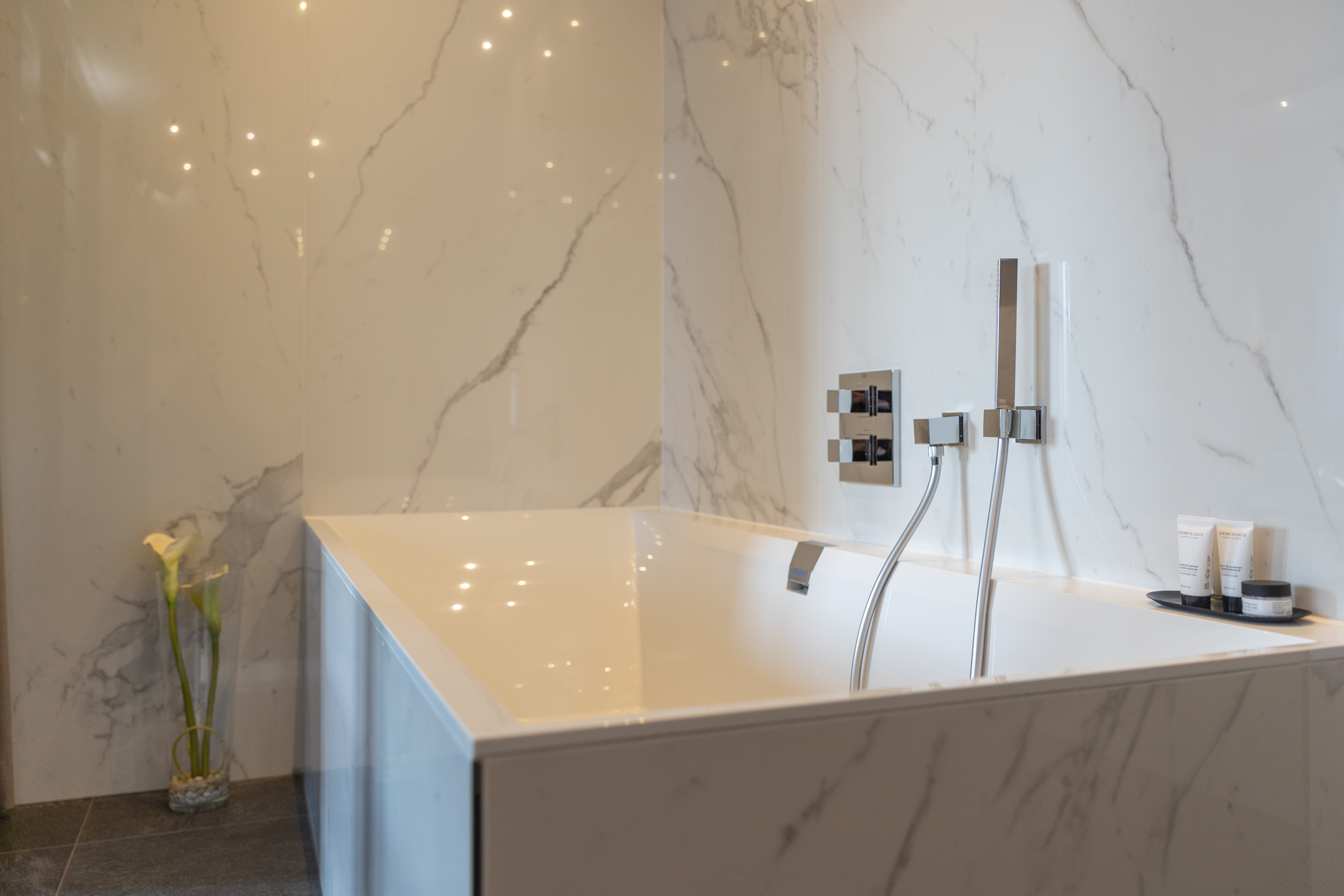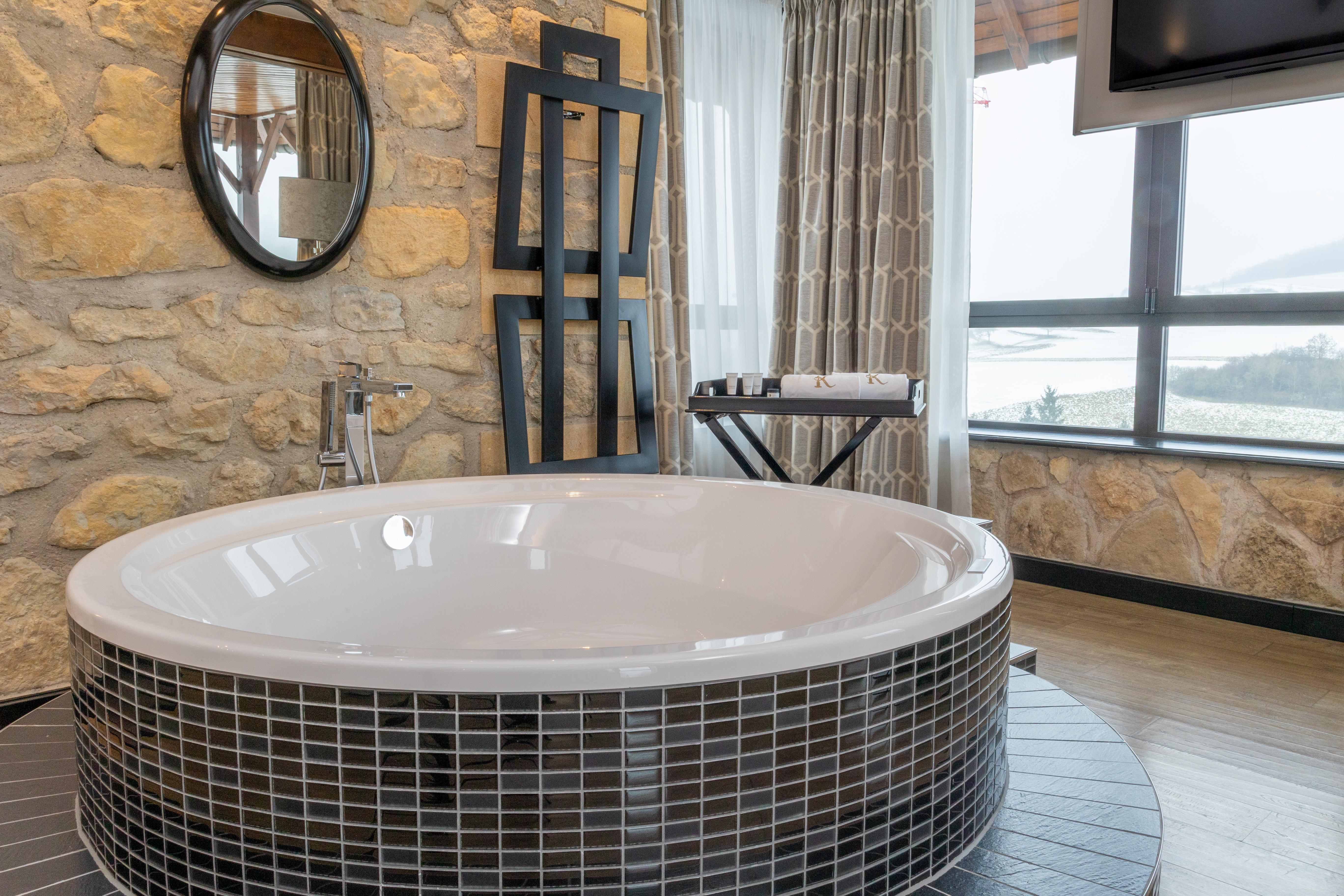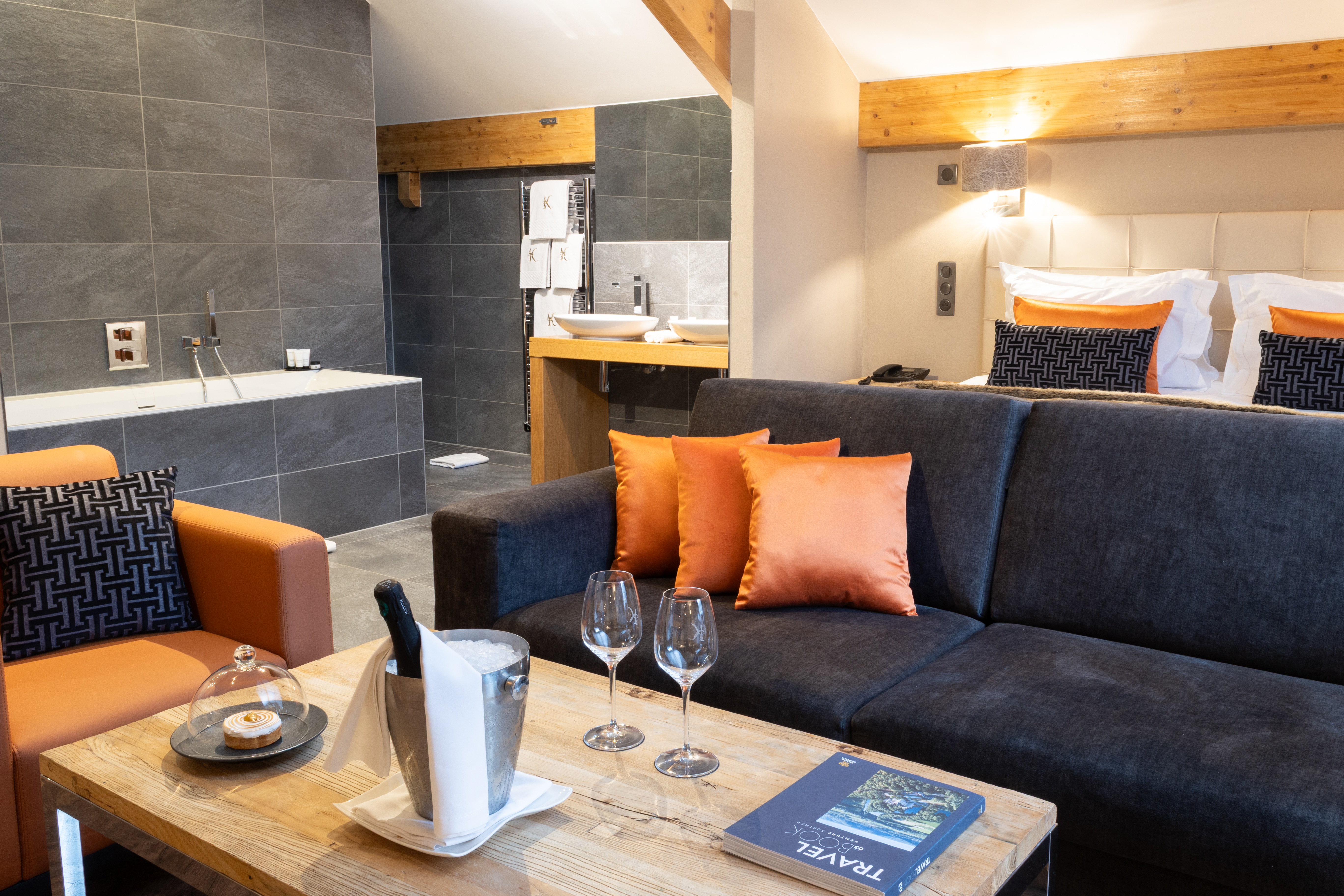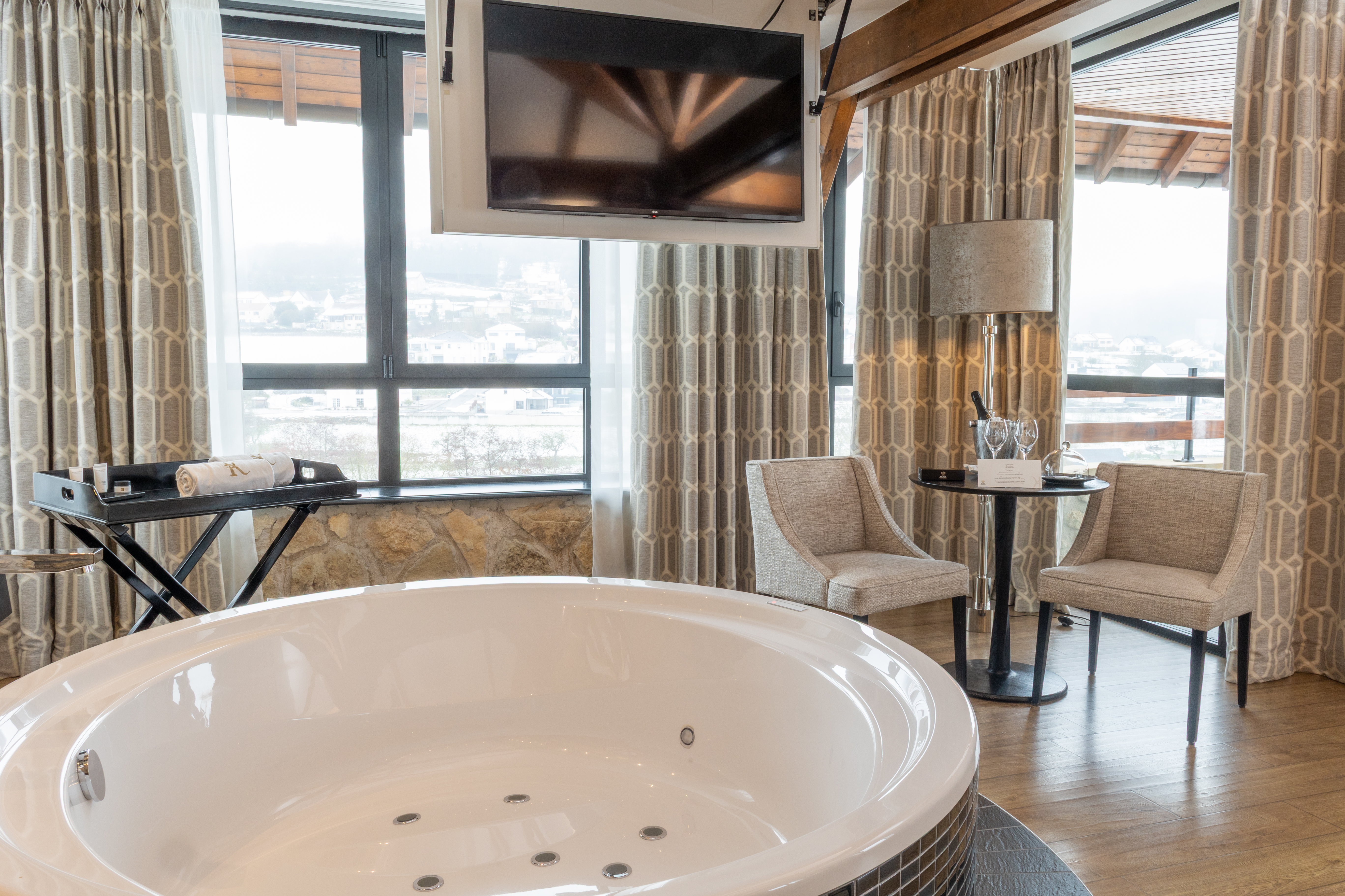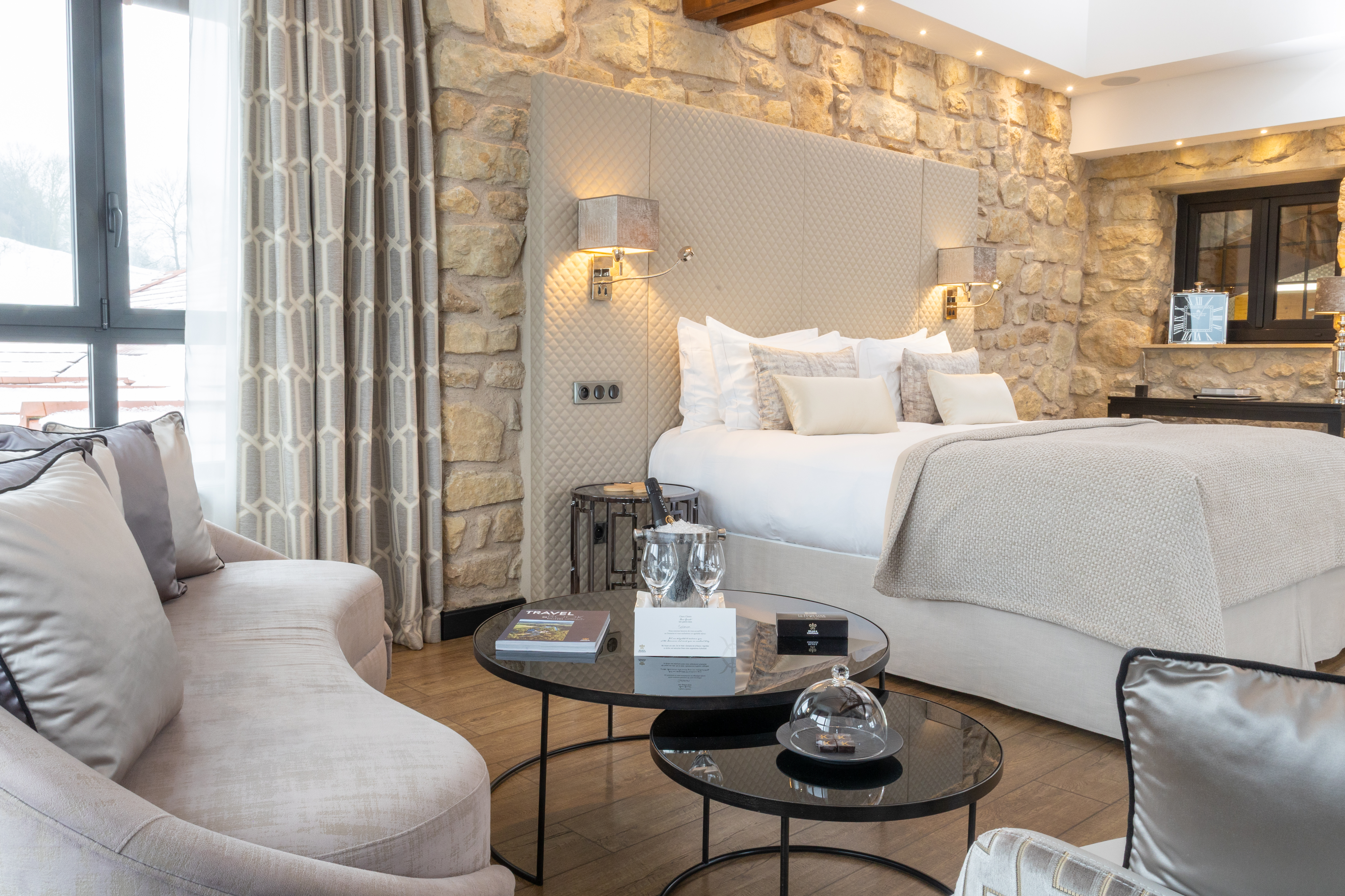 Enjoy a moment of relaxation in our 37 m2 Suite Joseph with its wooden beams and chic, cosy, countryside atmosphere, located at the top of the hotel with a nice view on the valle. This room has a king-sized bed, a large flat-screen TV, a Nespresso coffee machine, an open-plan bathroom with shower, bathtub, separate toilet and hair-dryer. It has Wi-Fi access, a safety deposit box and a mini-bar.