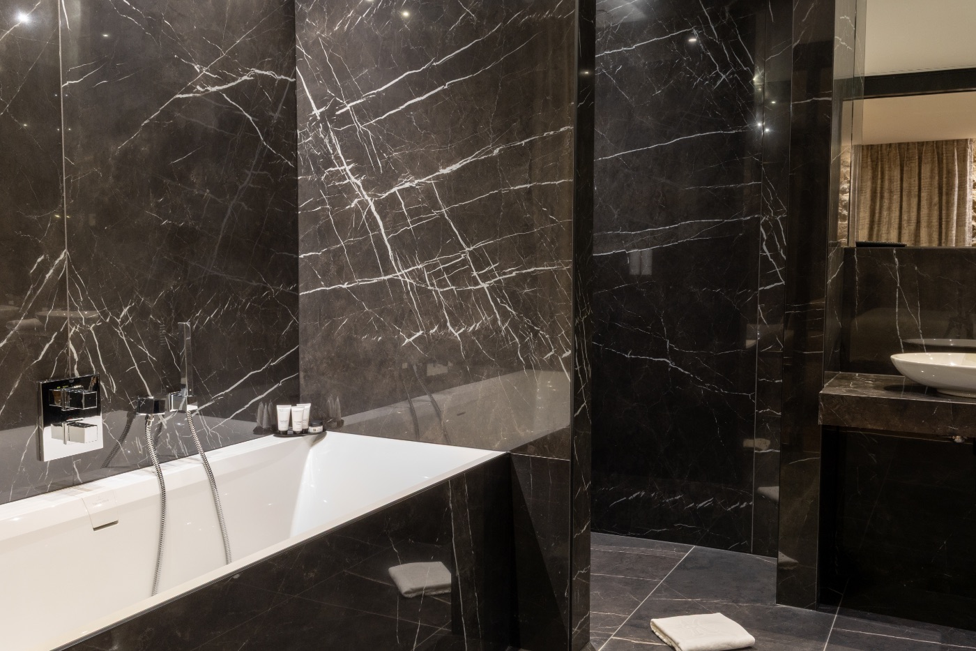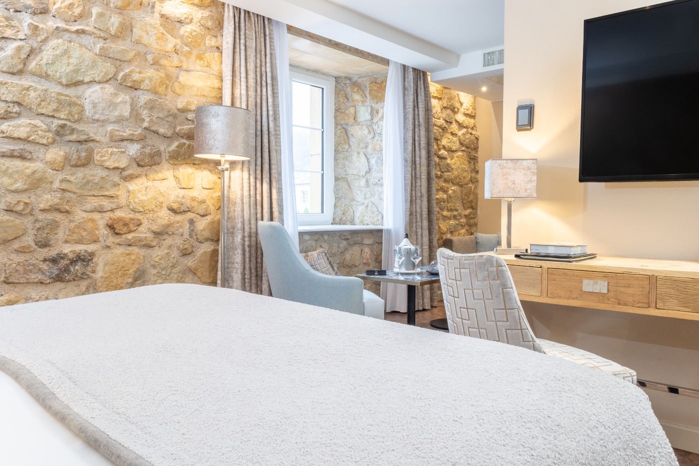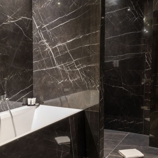 Why not choose our elegant 33 m2 Suite Thomas, which provides the perfect combination of soft beige hues and calming blues? You can start your day by relaxing on the balcony and take in the breathtaking view of the valley. This room has a king-sized bed, a large flat-screen TV, a Nespresso coffee machine, an open-plan bathroom with shower, designer bathtub, separate toilet and hair-dryer. It has Wi-Fi access, a safety deposit box and a mini-bar.
