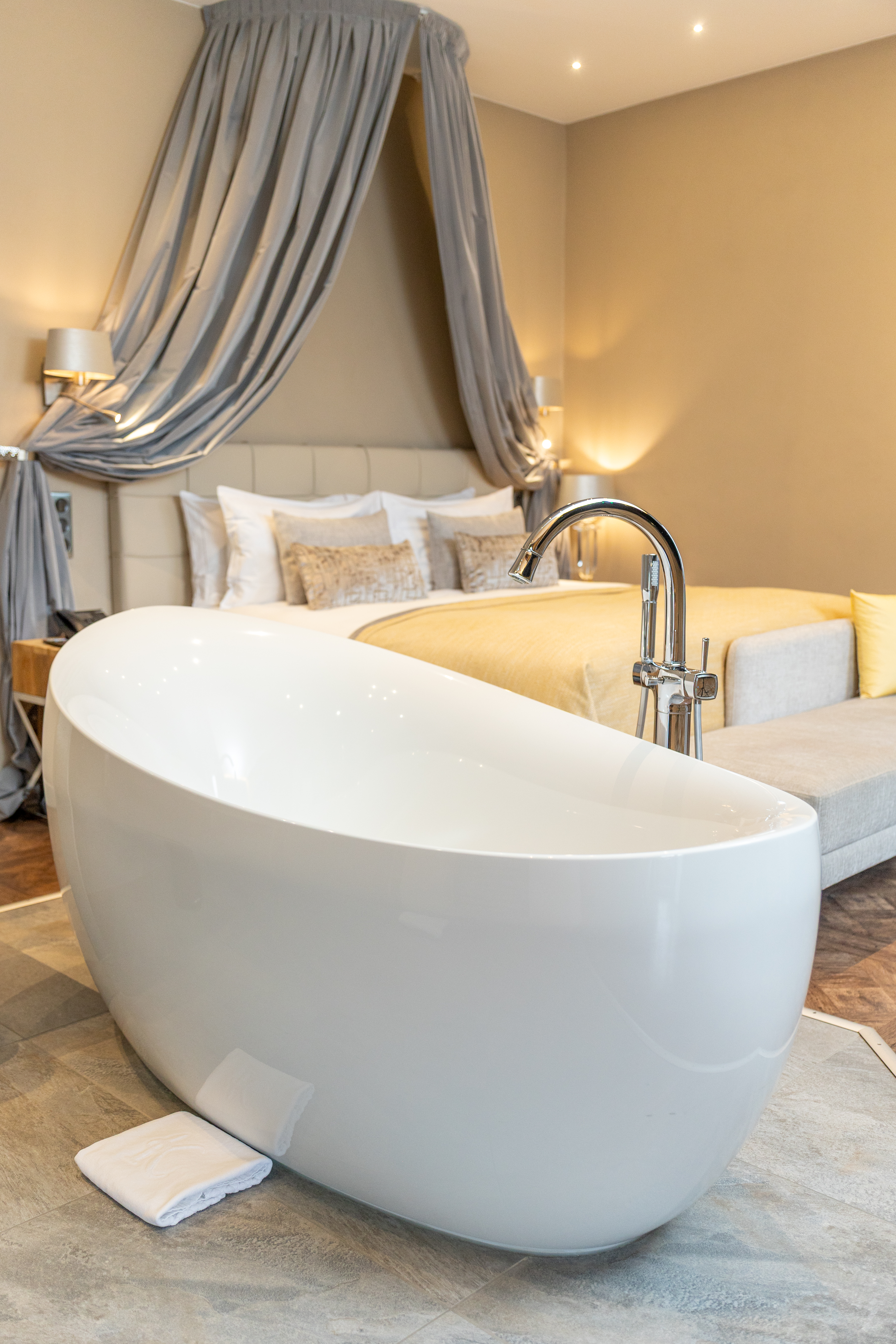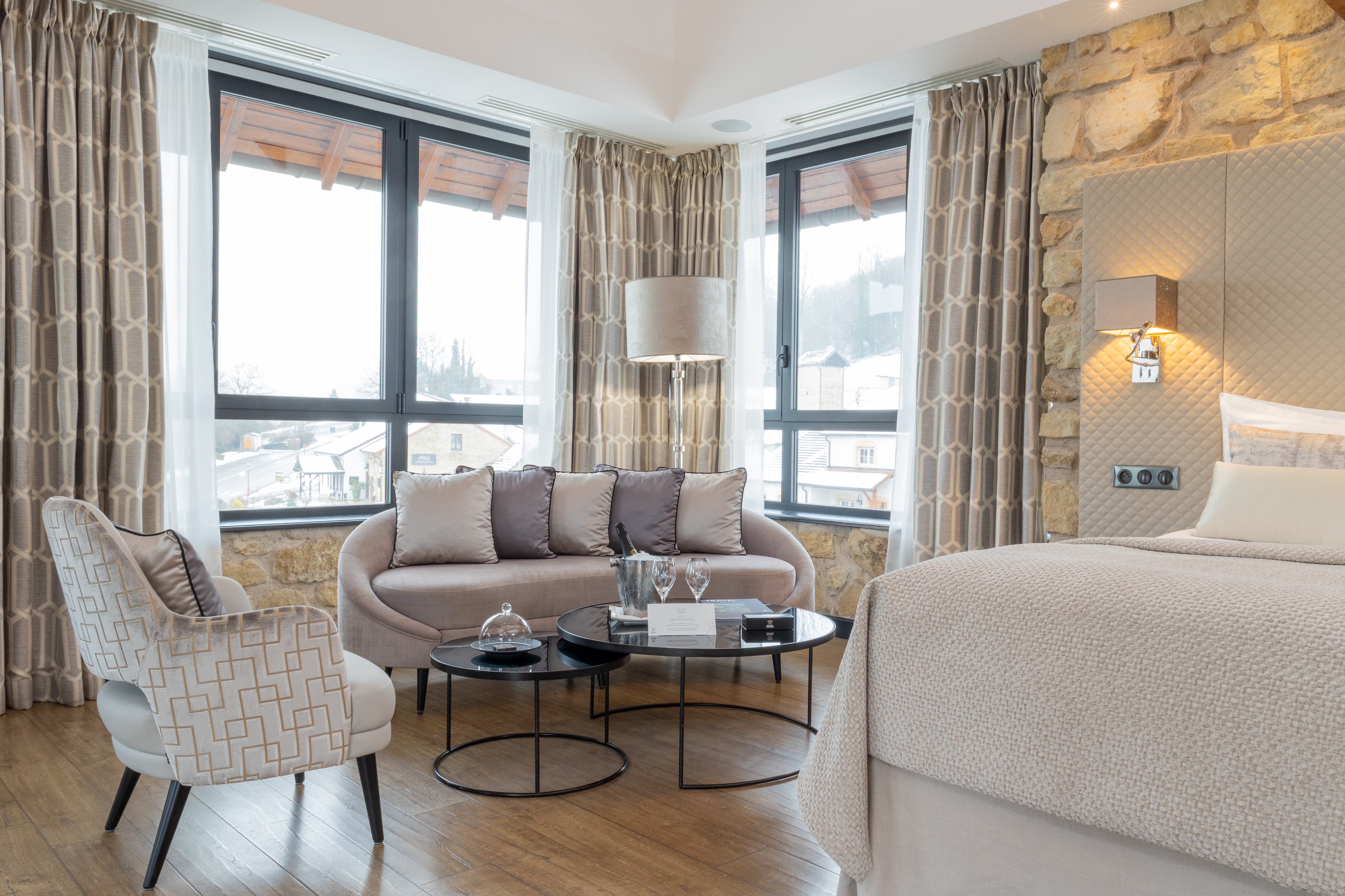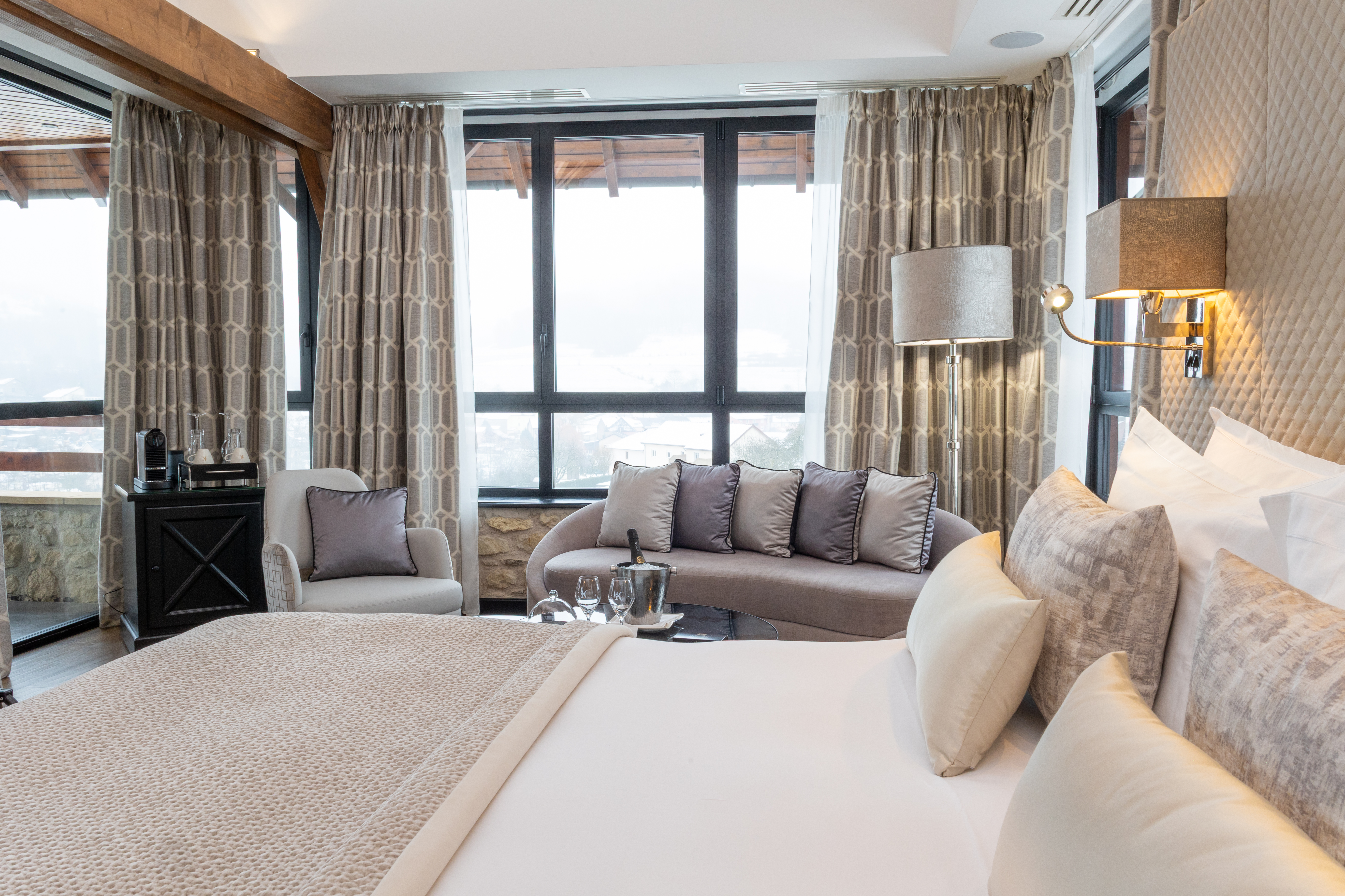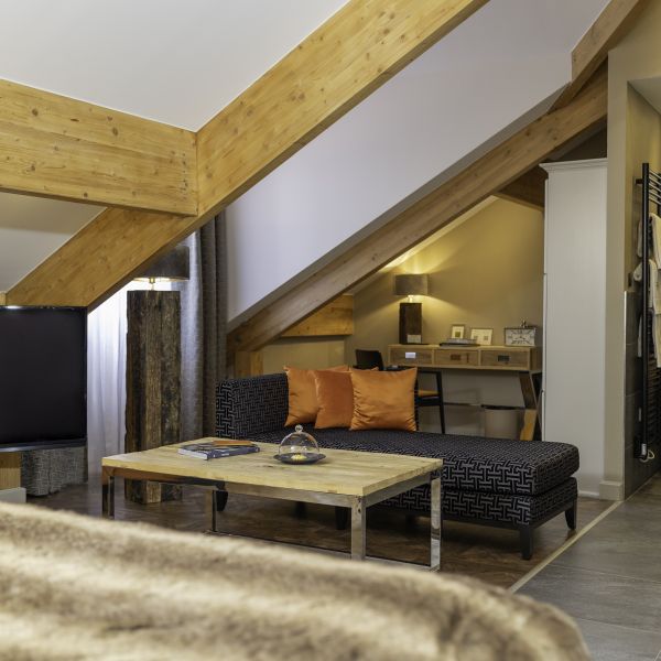 Why not stay in our 45 m² Top Suite Brigitte and relax in its stylishly, refined beige-hued elegant décor? You can start your day by relaxing on the balcony with a view on the valley. The room has a king-sized bed, a large flat-screen TV, a Nespresso coffee machine, a sofa bed that may be used as an extra bed, a bathroom with shower, a round bathtub, separate toilet and hair-dryer. It has Wi-Fi access, a safety deposit box and a mini-bar.