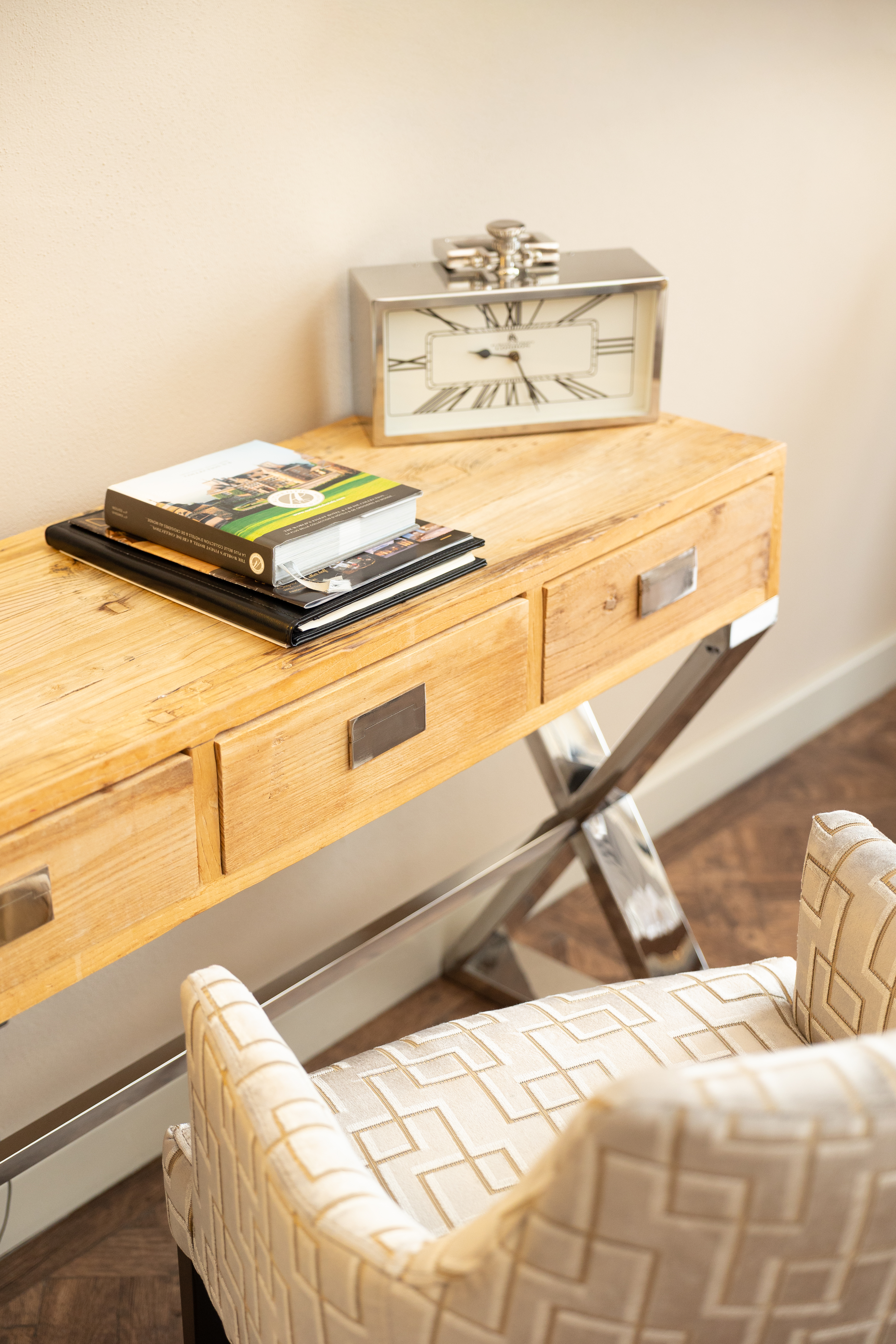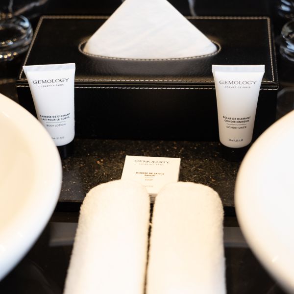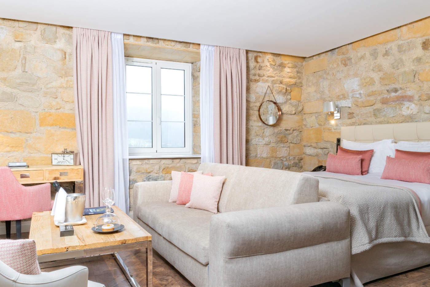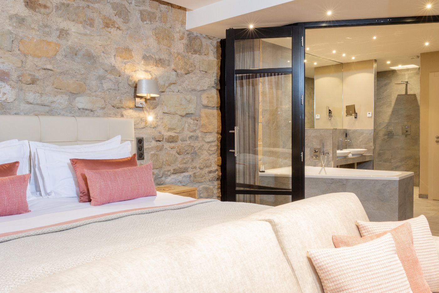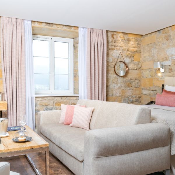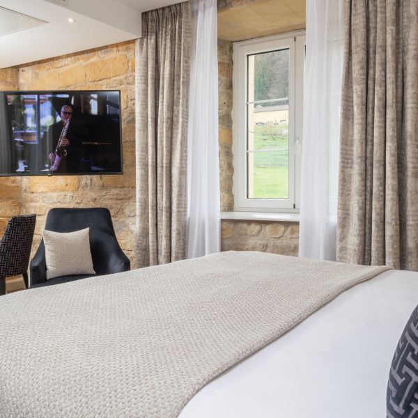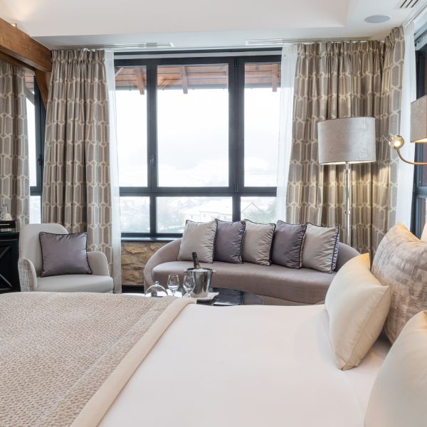 Why not relax in our 39 m2 Junior Suite with its elegant, harmonious pink hues, and cosy, boudoir atmosphere with its nice view over the valley? The room has a king-sized bed, a large flat-screen TV, a Nespresso coffee machine, a sofa bed that may be used as an extra bed, a bathroom with shower, a bathtub, separate toilet and hair-dryer. It has Wi-Fi access, a safety deposit box and a mini-bar.