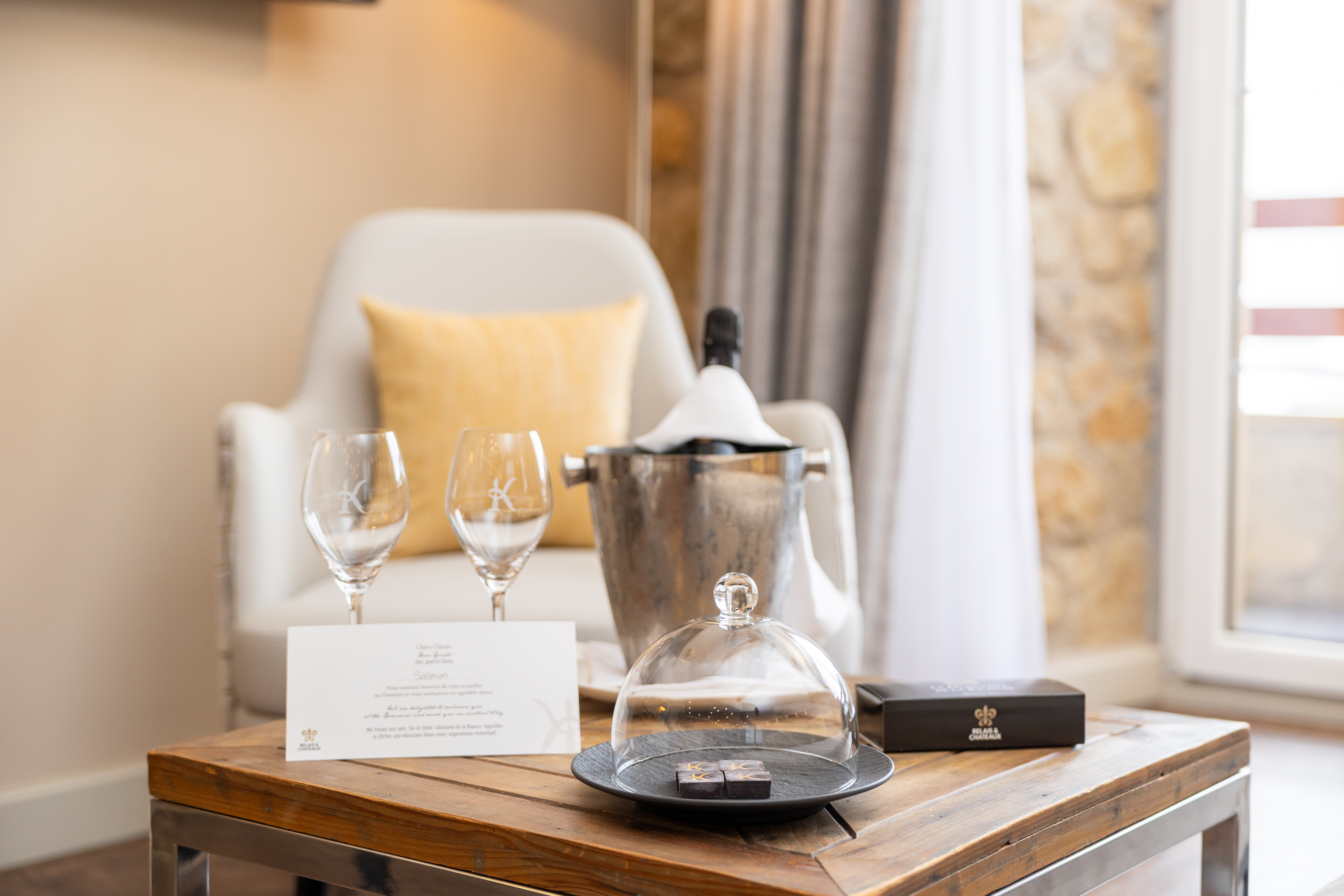 This 37m2 Junior Suite subtly combines metallic gold and burgundy hues for an elegant night’s sleep with a view of the Auberge, the entrance of the Domaine, the valley and the parking. The room has a king-sized bed, a large flat-screen TV, a Nespresso coffee machine, a sofa bed that may be used as an extra bed, a bathroom with shower, a bathtub, separate toilet and hair-dryer. It has Wi-Fi access, a safety deposit box and a mini-bar.