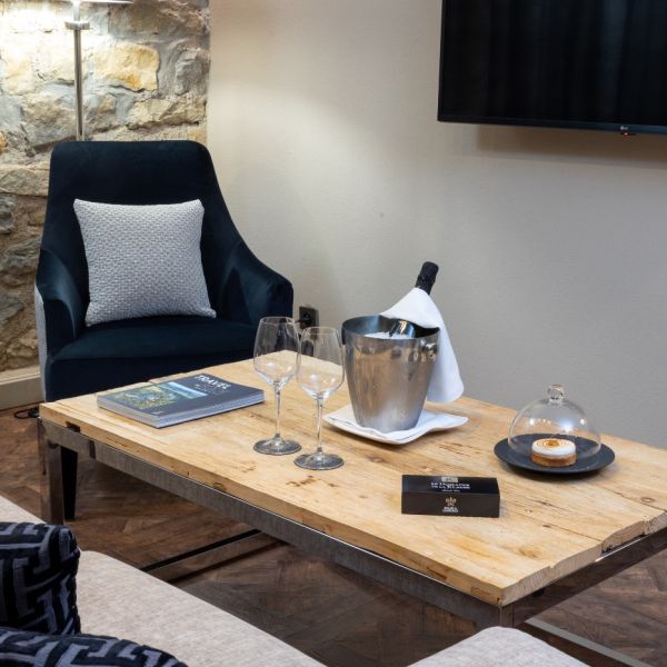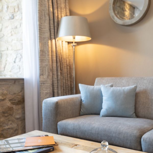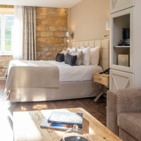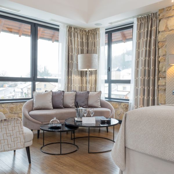 This charming, chic and sophisticated Junior Suite measures 41 m2. It has a warm, cosy atmosphere with just a hint of burgundy tones with a view of the Auberge, the entrance of the Domaine, the valley and the parking. The room has a king-sized bed, a large flat-screen TV, a sofa bed that may be used as an extra bed, a Nespresso coffee machine, a bathroom with shower, a bathtub, separate toilet and hair-dryer. It has Wi-Fi access, a safety deposit box and a mini-bar.