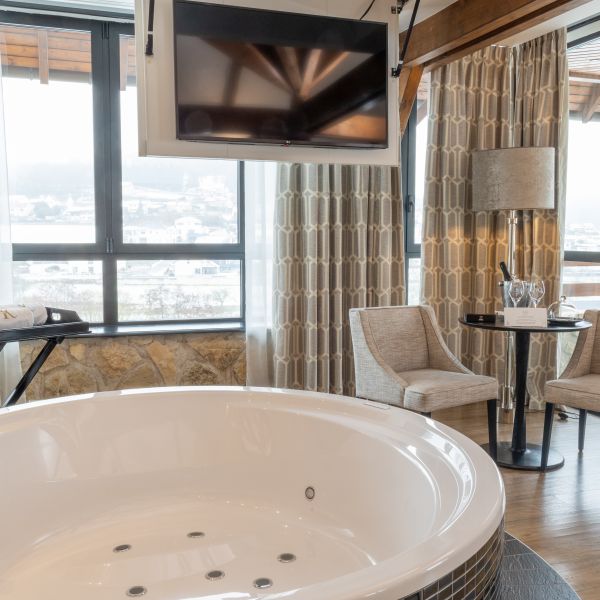 Simply marvel at its beauty and let yourself be enchanted by the magic of our most exquisite suite. This 80-sq.m. gem is situated at the very top of the Domaine's tower, providing all the serenity of wide open spaces and breathtaking 270-degree panoramic views over the valley. In this unique and opulent room, you will find a round, 1.80 m diameter jacuzzi at the foot of your bed, a modern lounge area, a dressing room, a retractable giant flat-screen TV that comes out of the ceiling at the 'click' of a button, an automatic blind system, separate toilets, a fully-furnished terrace, as well as many other little extras to ensure that your stay will be the perfect combination of calm, luxury and voluptuousness. Deluxe service option, only available in this suite, a romantic dinner served in-room according to your tempo!