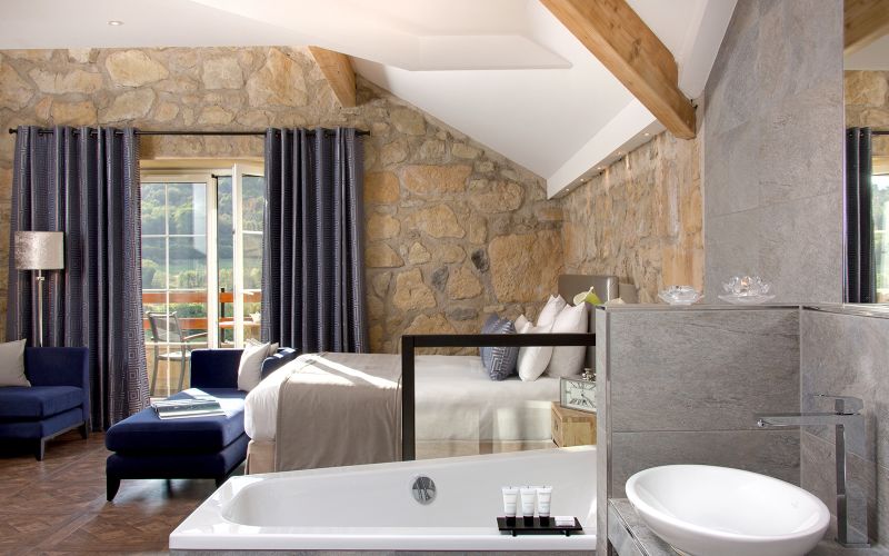 Cette junior suite de 34 m² à l'esprit moderne vous séduira par sa décoration soignée dans des teintes bleutées et ses belles tentures au style Hermès avec sa vue sur l'Auberge, l'entrée du Domaine, la vallée et le parking. Vous y trouverez un lit King size, une grande TV à écran plat, une machine à café Nespresso, une salle de bain avec douche, baignoire, WC séparé et sèche-cheveux. Elle dispose d'un accès Wifi, d'un coffre-fort et d'un mini bar.